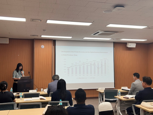王文娟副教授以“数字营商环境对湖北省民营经济发展的影响”为主题的学术报告在会上引起了强烈的反响。报告介绍了湖北省数字营商环境和民营经济发展的现状、数字营商环境对民营经济发展的影响路径、数字营商环境对湖北省民营经济发展影响的计量分析结果等内容。主题报告后,全北国立大学教授与王文娟副教授和万涛副教授就该主题进行了热烈讨论。
