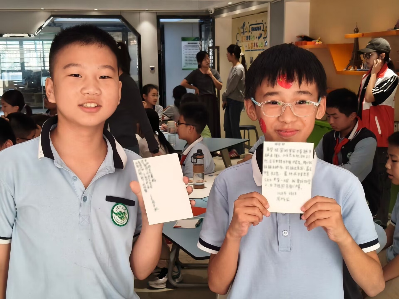 在此次活动中,孩子们在大学生志愿者的帮助下,了解了中国近代史,并了解了相关英雄事迹。在过程中,孩子们积极举手抢答,在互动过程中加深了对革命历史的了解,感受到了英雄先辈们的爱国情怀。活动最后,孩子们在一张张红色的贺卡上写下对祖国未来发展的祝福。照片中,孩子们笑容灿烂,眼中闪烁着对祖国的热爱。