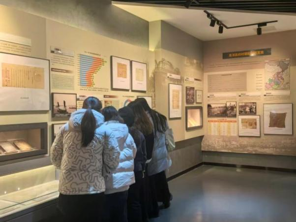 移步中国近现代财税历史展厅,晚清《商税则例》的泛黄原件、南京国民政府时期的财政报表、革命根据地的救国公债,将百年财税转型的波澜铺展在眼前。在展陈着民国股票凭证与边区粮秣账簿的展柜前,带队老师结合税收学课程内容解读:“从封建财税体系瓦解到现代税制萌芽,这些史料正是‘财政与国运同频’的生动注脚。”同学们在南京国民政府财税展区的互动图表前讨论热烈,透过数据变化,直观理解了动荡时期财税政策对经济民生的影响。
