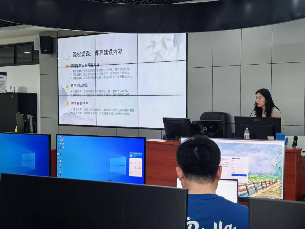 活动现场气氛热烈,各参赛教师围绕“课程思政”主题,展示了精心准备的教学设计和课堂案例。徐一娉老师在《商务分析软件应用》课程汇报中,将职业道德、团队协作、创新实践等思政元素系统融入数据分析教学。在多元线性回归分析章节的教学演示中,她引导学生从政策制定者角度思考变量选择,深刻理解新发展理念的科学性,培养学生实事求是的治学态度和严谨的数据分析职业素养。